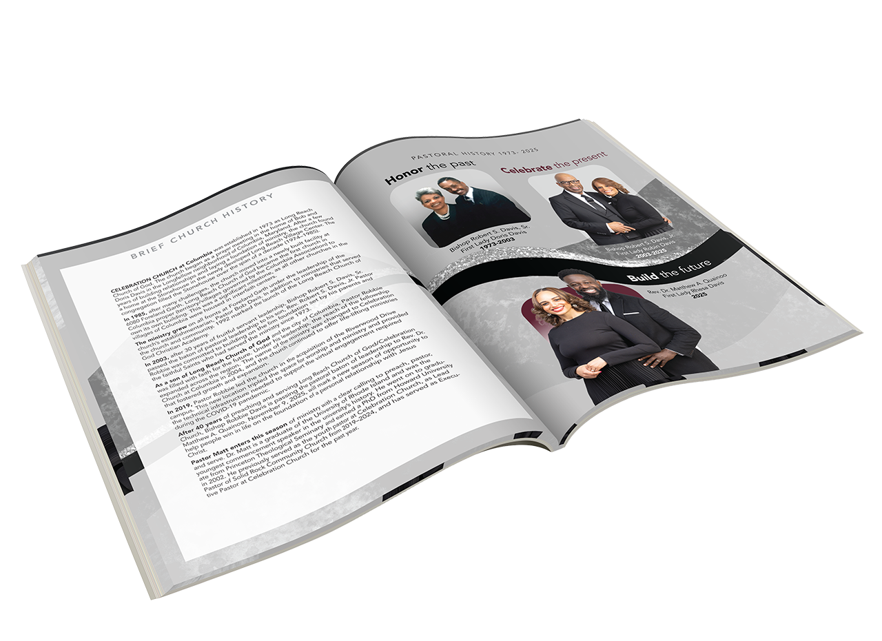 Mission: A booklet to highlight the journey, mark a milestone in the life of the church, honor the history, celebrate the outgoing leadership, and welcome the future leadership. A commemorative occasion of remembrance.
